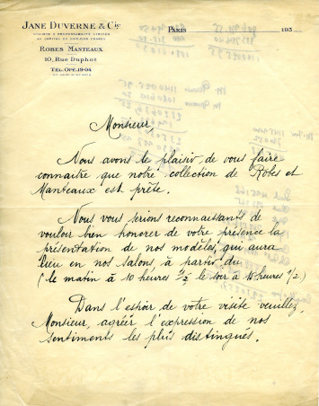 Invitation manuscrite pour assister à la présentation d'une collection au 10 rue Duphot, s.d. Arch. dép. Corrèze, 15Num/85.