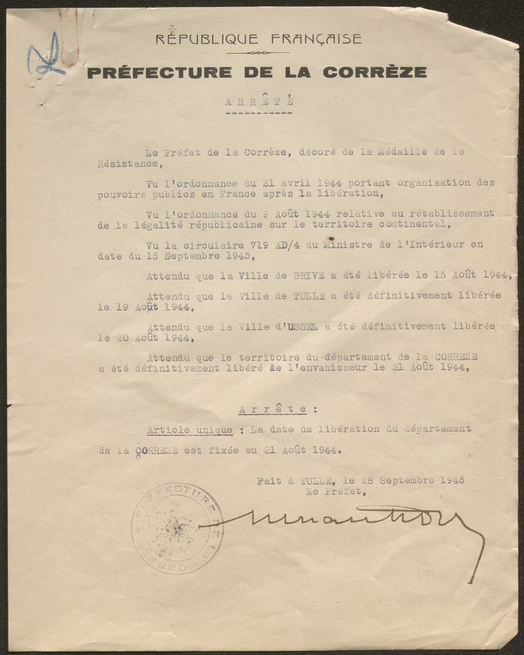 L'arrêté de la Libération de la Corrèze