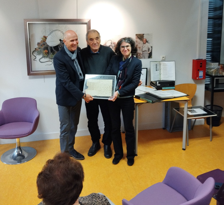 Michel Devouge remet un document original écrit de la main de Jeanne Villepreux-Power à Justine Berlière, directrice des Archives départementales de la Corrèze et Philippe Lescure, conseiller départemental délégué à la culture. Arch. dép. Corrèze, 1Num/2457.